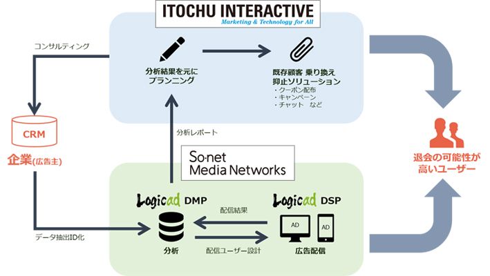 この協業は、伊藤忠グループにおいてデジタルマーケティング事業を広範囲に展開する当社と、人工知能を活用したDSP(*1)『Logicad』でのインターネット(WEB)広告配信、運用に実績のあるソネット・メディア・ネットワークスが、DMP(*2)を利用した企業のマーケティング活動を包括的に支援するものです。